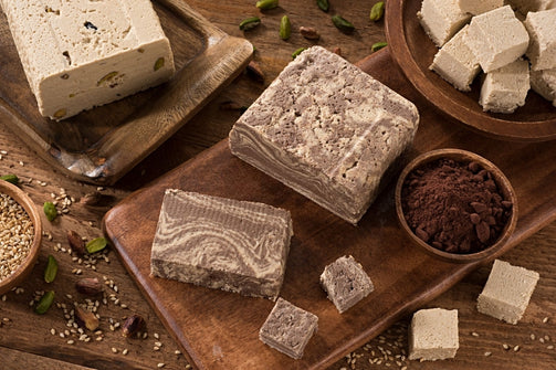 Halva is a dessert made of ground sesame seeds and tahini for vegans and vegetarians.